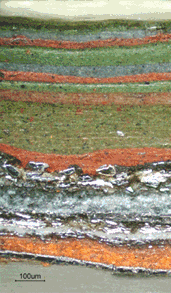 Es lassen sich alle Schichten der Grundierung, des Zwischen- und Decklacks finden, im Optimalfall auch auf Bindemittel und