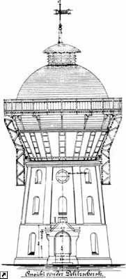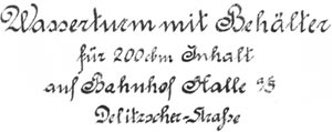Diese Zeichnung vom 30. Juli 1906 stellt das Bauvorhaben zur Erhöhung des Wasserdrucks am Personenbahnhof vor. Aufgrund der rasanten Zunahme des Güter- und Personenverkehrs in der Industrieregion Halle ist der Wasserverbrauch für Damflokomotiven enorm angestiegen. Um Druckschwankungen im Netz auszugleichen und ein weiteres Reservoir an einem zentralen Punkt im Bahnhofsbereich zu haben, wurde dann der Klönne-Turm errichtet. Das Kesselspeisewasser kam aus dem Bahnbetriebswerk Peißen, östlich der Stadt. Dessen Kapazität allein reichte aber bald nicht mehr aus. Die halleschen Bahn-Wassertürme waren mit einem weiteren Zuflussleitung aus dem öffentlichen Wassernetz versehen. Bei Bedarf konnte somit Wasser aus dem Netz der Stadt entnommen und zum Befüllen der Kessel und Tender genutzt werden.