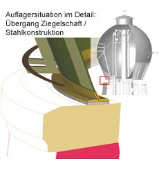 aufgenommen und aus den gewonnenen Daten ein 3D-Modell generiert. Das Denkmal wird so im virtuellen Raum bis in den Behälter hinein "begehbar", der Rohrverlauf, Ventile und Schwimmer lassen sich aus allen Richtungen darstellen. Die Bestandsaufnahme bildete das Grundgerüst für die ebenfalls digitale Erfassung des Zustands von Ziegelschaft und Stahlkonstruktion. So konnten beispielsweise Einschusslöcher, Durchrostungen und Reparaturen, zentimetergenau eingemessen und dargestellt werden.